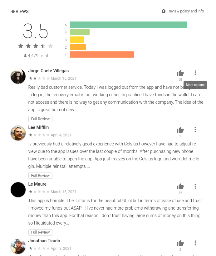 For å bruke Celsius må man installere en app. Jeg blir ikke akkurat kjempeivrig når jeg ser anmeldelsene. Kanskje driver Celsius med noe lugubert? Er det kanskje en lang prosess å gjøre uttak derfra? Vi får håpe den lave ratingen kun skyldes bugs som er fikset til nå.